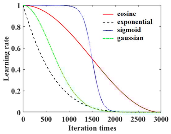 In this work, four DLRND strategies (i.e., exponential decay [38], cosine decay [39], Gaussian decay [40], and Sigmoid decay [41]) were used and compared, which are presented as follows: