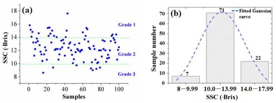 The SSC values of 100 apple samples are presented in Figure 5a. One hundred apple samples were categorized into three different grades (i.e., Grade 1, Grade 2, and Grade 3) according to the SSC level. Based on the analysis of variance (ANOVA), the statistical analysis results of the SSC values for each apple sample grade are shown in Table 1. p < 0.05 was considered significant.