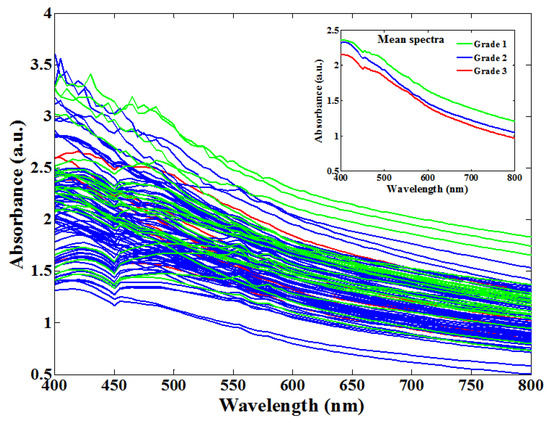 Figure 6 shows that the whole-spectra profiles of all the apples look similar. Although the spectra of apples with different SSC values overlap, the mean spectra of all three degrees of SSC can be distinguished, which are presented in the subgraph of Figure 6. From the mean spectra of the apples, we can see that the absorbance is, to an extent, proportional to the SSC of the apples in a fixed optical path, which is consistent with the Lambert–Beer law [44]. Therefore, the SSC value of an apple can be determined based on its spectral absorbance using quantitative modeling methods. At the same time, a quality assessment of apples can also be achieved.