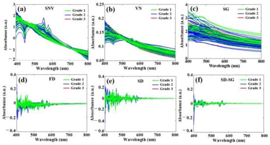 From Figure 7a,b, although the principles behind the SNV and VN pretreatments are different, the pretreated spectra are also basically similar because of their approximate mathematical form. By using the SNV and VN pretreatment methods, the differences between different grades of apple samples are significantly reduced, and the differences between the spectra of apple samples in the same grade are also reduced. At the same time, the influence of the inhomogeneity of apple juice filtered through filter gauze can be reduced by using SNV and VN. Figure 7c shows that the SG smoothing pretreatment does not change the profiles of the spectra, but the noises can be significantly reduced. Figure 7d shows that the FD pretreatment method can separate the overlapping absorption peaks from the raw spectra, remove the spectra bias and baseline offset, and increase the resolution of the spectra, but, at the same time, the noise is also amplified. As for the SD pretreatment method, Figure 7e shows that the resolution of the spectra can be increased more obviously, but the noises are also amplified. In addition, the pretreatment combination method is also considered in this study, e.g., SG smoothing combined with the SD method; Figure 7f shows that the noises were not only greatly reduced but also that the spectra bias and baseline offset were reduced.