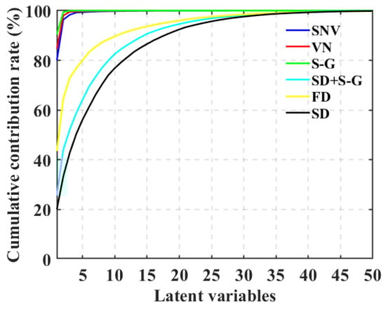 Cumulative contribution rate curves of six different spectra pretreatment methods under different numbers of LVs.