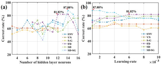 Based on the aforementioned six pretreatment methods, six BPNN combination models were established. To obtain satisfactory classification accuracy for apple SSC with each model, several important BPNN parameters were repeatedly adjusted, such as the number of neurons in the hidden layer, the learning rate (η), and the training times. The effects of the number of neurons in the hidden layer and the learning rate (η) on the correct classification rate regarding apple SSC values (based on six different BPNN models) are shown in Figure 9a,b, respectively.
