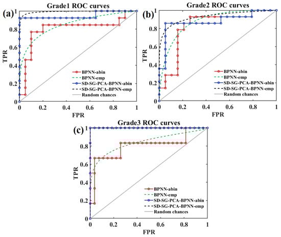 Figure 11 shows that the SD-SG-PCA-BPNN model outperforms the BPNN model for all three degrees of classification, and in cases where the false positive rate (FPR) is relatively low, the true positive rate (TPR) is able to quickly approach the upper left region, which means that the SD-SG-PCA-BPNN model has a high hit rate in predicting positive cases and a high accuracy rate in predicting negative cases, i.e., the model has high sensitivity and a low false positive rate. At the same time, its corresponding area under the ROC curve (i.e., AUC) is higher, which also means that the SD-SG-PCA-BPNN model is more capable of distinguishing positive and negative cases; thus, the prediction results are more reliable.