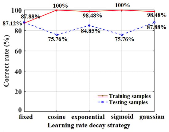 Figure 12 shows that the classification accuracies of the cosine DLRND strategy and Sigmoid DLRND strategy reached 100% in the training set using the SD-SG-PCA-BPNN model; however, the classification accuracies in the testing set were lower than those of the fixed learning rate, which may have been caused by model overfitting. The exponential DLRND strategy and Gaussian DLRND strategy have obvious advantages in controlling model overfitting and optimizing the training set’s classification accuracy. For the training samples, the classification accuracy of the SD-SG-PCA-BPNN model, combined with the exponential DLRND strategy and the Gaussian DLRND strategy, is improved to 98.48%, which is better than that of the fixed learning rate. Moreover, the classification accuracy of testing samples using the SD-SG-PCA-BPNN model, combined with the Gaussian DLRND strategy, reaches 87.88%, which is higher than that of the SD-SG-PCA-BPNN model combined with other strategies. Therefore, the Gaussian DLRND strategy is optimal in this work.