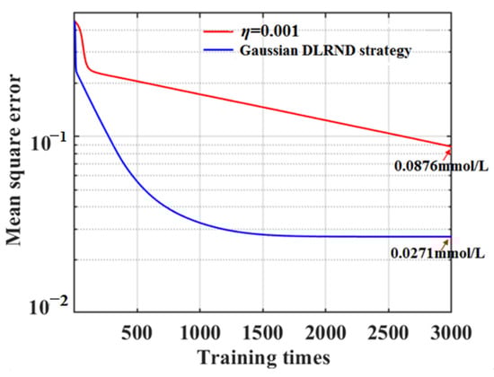To verify the performance of the SD-SG-PCA-BPNN model combined with the Gaussian DLRND strategy in classifying apple SSCs, its MSE curve was compared with that of the fixed learning rate, as shown in Figure 13.