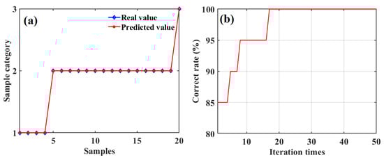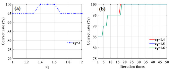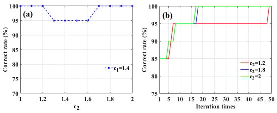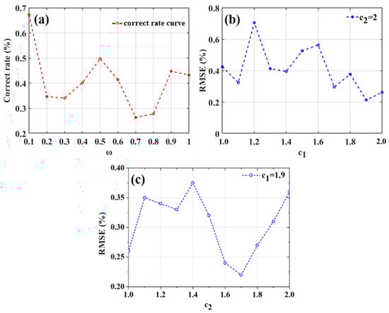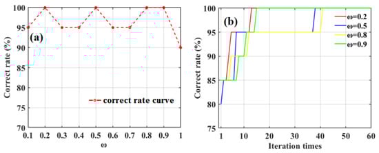 To further improve the qualitative accuracy of the SD-SG-PCA-BPNN model in classifying apple SSC values, a PSO algorithm was employed to optimize the parameters of the BPNN model. A PSO algorithm’s performance is usually determined using three main factors, i.e., the inertia weight factor (ω), the acceleration factor (c1), and the acceleration factor (c2). To obtain ω, c1 and c2 were both set to two [43]; then, the effect of ω on the correct apple SSC classification rate using the SD-SG-PCA-PSO-BPNN model combined with the Gaussian DLRND strategy was investigated, as shown in Figure 14a.