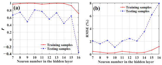 Figure 18a,b show that the results are unsatisfactory for the testing samples when there are nine neurons in the hidden layer, even though the correlation coefficient (r) between the predicted SSC value and the actual SSC value of the training samples is highest and the RMSE value is lowest, i.e., RMSE = 0.2337 °Brix and r = 0.99087, and RMSE = 2.1722 °Brix and r = 0.48445 for the testing samples. However, when there are 10 neurons in the hidden layer in the training samples, although r is slightly lower, and the RMSE is slightly larger than that of the hidden layer with 9 neurons, the correlation coefficient between the predicted SSC and the actual SSC is highest for the testing samples, and the RMSE value is the lowest, i.e., RMSE = 1.1067 °Brix and r = 0.81056. Here, the predicted results for the testing samples were used as criteria for determining the optimal number of neurons in the hidden layer of the BPNN in quantitatively predicting apple SSC values. Therefore, the optimal neuron number, in this case, is 10.