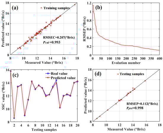 Quantitative predicted SSC for training-set and testing-set apples. (a) predicted results of training-set apples; (b) the SSC RMSEP curve of testing-set apples under the different evolution numbers of SD-SG-PCA-PSO-BPNN model combined with Gaussian DLRND strategy; (c) the predicted SSC and the real SSC of test set apples; (d) predicted results of testing-set apples.