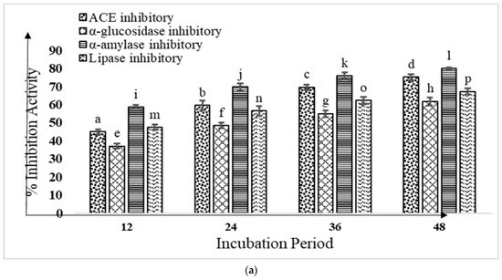 To estimate the anti-diabetic effects and ACE inhibitory properties of fermented buffalo and camel milk, the KGL4 strain’s potential in conjunction with yeast WBS2A was assessed (Figure 1a,b). The milk and incubation times varied significantly (p < 0.05), and as the incubation times increased, the inhibitory and anti-diabetic effects of ACE were subsequently also elevated. The maximum ACE inhibitory, lipase inhibitory, alpha-glucosidase inhibitory, and alpha-amylase inhibitory activities of the fermented buffalo milk (FBM) (75.25 ± 1.72, 61.79 ± 2.14, 80.09 ± 0.51, and 67.29 ± 1.75) and fermented camel milk (FCM) (77.96 ± 2.61, 73.85 ± 1.19, 85.37 ± 2.15, and 70.86 ± 1.02), compared to the other incubation times at 37 °C, were seen at 48 h.