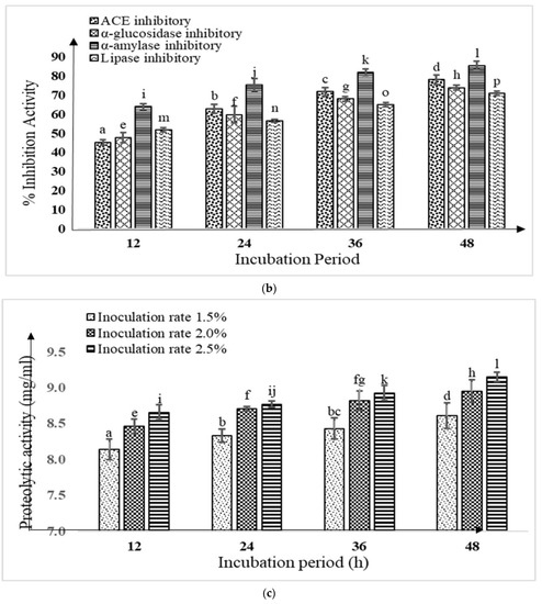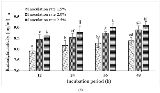 With increasing inoculation rates (1.5%, 2.0%, and 2.5%) and incubation times (12, 24, 36, and 48 h), KGL4 + WBS2A fermented buffalo and camel milk considerably (p < 0.05) increased the proteolytic activity, despite the fact that there were no statistically significant connections found between the inoculation rate and incubation period (Figure 1c,d). When milk was inoculated at a rate of 2.5%, the highest level of proteolysis activity was seen after 48 h.