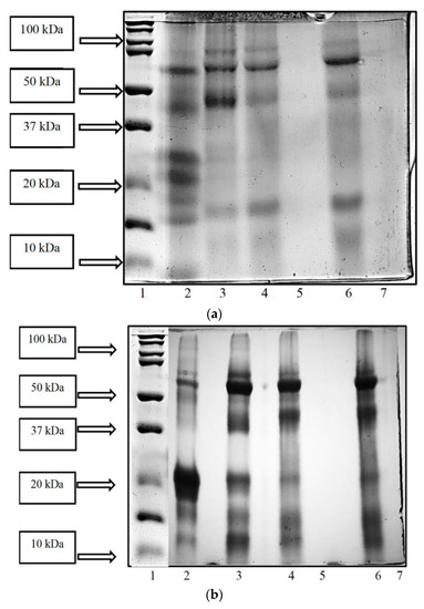 - Laemmli, U.K. Cleavage of structural proteins during the assembly of the head of bacteriophage T4. Nature 1970, 227, 680–685. [Google Scholar] [CrossRef]