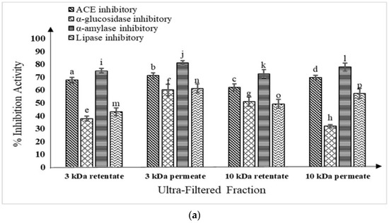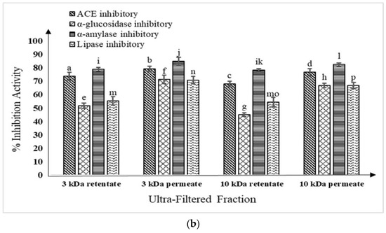 (a) Fermented buffalo milk (M11 + WBS2A) ultra-filtered fractions (<3 kDa, >3 kDa, <10 kDa, and >10 kDa) ACE inhibitory and anti-diabetic activities; mean ± SD of three replicate studies (n = 3); values with different superscripts differ significantly (p < 0.05). (b) Fermented camel milk (M11 + WBS2A) ultra-filtered fractions (<3 kDa, >3 kDa, <10 kDa and >10 kDa) ACE inhibitory and anti-diabetic activities; mean ± SD of three replicate studies (n = 3); values with different superscripts differ significantly (p < 0.05).