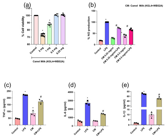 Effect of the fermented camel milk (KGL4 + WBS2A) on (a) cell viability (MTT test); (b) NO productions; (c) tumor necrosis factor-alpha; (d) interleukin-6; and (e) interleukin-1 beta production in the supernatants of LPS-stimulated murine macrophage (RAW 264.7) cells. Data were analyzed using one-way ANOVA and then Tukey’s post hoc test. Values were presented as mean ± SEM; (n = 3) * vs. control, # vs LPS; LPS—lipopolysaccharide; CM—fermented camel milk (KGL4 + WBS2A) (0.25 mg/mL).