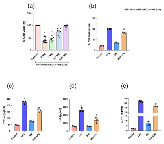 Effect of the fermented buffalo milk (KGL4 + WBS2A) on (a) cell viability (MTT test); (b) NO productions; (c) tumor necrosis factor-alpha; (d) interleukin-6; and (e) interleukin-1 beta measured in the supernatants of LPS-stimulated (RAW 264.7) cells. Data were analyzed using one-way ANOVA and then Tukey’s post hoc test. Values were presented as mean ± SEM; (n = 3). * vs control; # vs LPS; LPS—lipopolysaccharide; BM—fermented buffalo milk (KGL4 + WBS2A) (0.25 mg/mL).