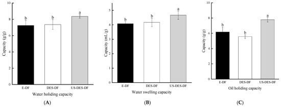 Water-holding capacity (WHC), water swelling capacity (WSC), and oil-holding capacity (OHC) of E-DF (A); DES-DF (B); and US-DES-DF (C). Different lowercase letters indicate significant differences (p < 0.05), while the same letter indicates no significant difference (p > 0.05) (Duncan’s test).