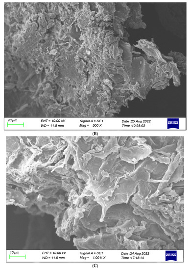 SEM images of E-DF (A), DES-DF (B), and US-DES-DF (C). Magnification: 500× and 1000×.