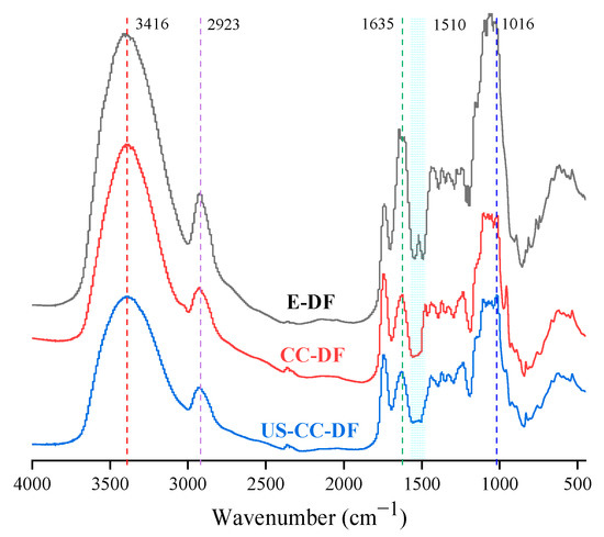 The FT-IR spectra of the DFs were determined (Figure 3). The spectra and individual peak shapes of the three orange fibers were similar, indicating comparable chemical compositions. The large O–H stretching vibration absorption peak (3200–3500 cm−1) indicated the presence of abundant hydrogen bonds [13]. The polysaccharide’s characteristic methyl and methylene C–H bond stretching vibrations were observed at 2923 cm−1, indicating a typical polysaccharide structure [50]. The C–O–C stretching vibration at 1016 cm−1 was a typical sugar aldehyde group [51]. The lignin aromatic phenyl ring absorption at 1510 cm−1 was only present in the E-DF spectrum, indicating that DES treatment dissolved the lignin. Although the E-DF, DES-DF, and US-DES-DF spectral peak intensities differed significantly, the overall peak type and position were remarkably similar, implying that the DF treated with DES or ultrasound-assist DES did not generate any new functional groups. The differences in the intensity of absorption peaks indicate that the physicochemical properties and functional activities of DFs could be diverse.