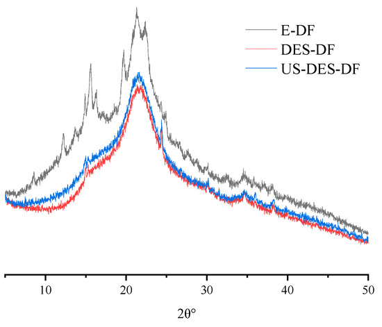 The properties of DF were greatly influenced by crystallinity, and a decrease in crystallinity may lead to increased extensibility and softness of the orange fiber. In contrast, increasing crystallinity may enhance thermal stability [35]. The XRD spectra of the three DFs were similar overall, signifying a comparable crystal structure (Figure 4). The E-DF spectra contain minor peaks that could result from enzymatic hydrolysis, causing cellulose breakdown in specific dietary fiber regions [52]. The central peak in all three spectra was around 22°, indicating the presence of a cellulose I crystal configuration. E-DF possessed the highest crystallinity index (36.70%), followed by DES (31.48%). Nevertheless, US-DES-DF exhibited a significantly reduced crystallinity index of 29.73% following ultrasound treatment, which may have resulted from cellulose chain disruption caused by ultrasonic cavitation.