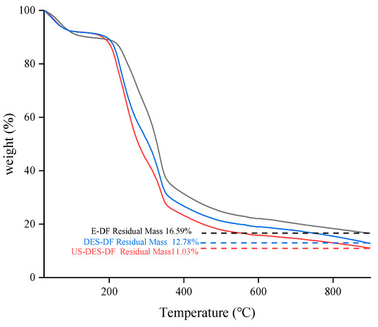 Thermal stability is crucial when applying DF, as heating is integral to most food processes. The thermal decomposition of orange fiber occurs in three stages (Figure 5). At the initial stage (60−160 °C), the evaporation of intramolecular free and crystal-bound water resulted in water loss. During the second stage of the process (160−250 °C), hemicellulose and pectin undergo thermal depolymerization, while the crystalline regions of cellulose undergo degradation. E-DF, DES-DF, and US-DES-DF had mass losses of 10.02%, 23.68%, and 28.09%, respectively. The structure of US-DES-DF was loosened by ultrasound-assisted DES extraction. Consequently, soluble dietary fiber (SDF) content in US-DES-DF was higher than in E-DF and DES-DF (Table 1), mainly consisting of pectin and some hemicellulose, resulting in the highest weight loss in US-DES-DF. The decomposition of some lignin and complex polymers was primarily responsible for the mass loss at the third stage (> 250 °C). After three stages, the residual masses of E-DF, DES-DF, and US-DES-DF were 16.59%, 12.78, and 11.03%, respectively. The amount of residue may be influenced by the different extraction methods and crystallinities [35]. The structural characteristics of DES and US-DES-DF reveal a looser arrangement as compared to E-DF, wherein the crystallinity of E-DF manifests as the highest among the three types of dietary fibers. This crystal structure of E-DF could be attributed to its superior thermal stability when subjected to high temperatures, while DES-DF and US-DES-DF exhibit a more extensive thermogravimetric decomposition.