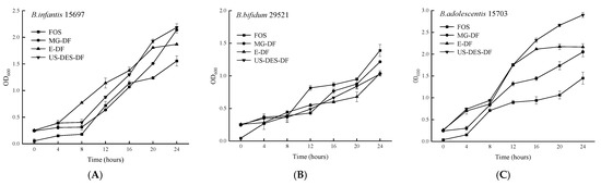 Growth curves (OD600) of B. infantis ATCC 15697 (A); B. bifidum ATCC 29521 (B); and B. adolescentis ATCC 15703 (C), in the presence of fructooligosaccharides (FOS), commercial orange fiber (MG-DF), enzyme-extracted orange fiber (E-DF), or ultrasound-assisted DES-extracted orange fiber (US-DES-DF), as sole carbon sources.