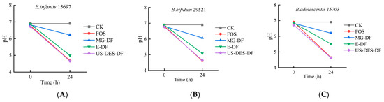 The pH changes after fermentation of B. infantis ATCC 15697 (A); B. bifidum ATCC 29521 (B); and B. adolescentis ATCC 15703 (C), in the presence of fructooligosaccharides (FOS), commercial citrus fiber (MG-DF), enzyme-extracted orange fiber (E-DF), or ultrasound-assisted DES-extracted orange fiber (US-DES-DF), as sole carbon sources, and no-carbon source control (CK).