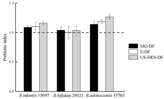 The prebiotic index (PI) value denotes the rate of probiotic strain growth in the presence of a prebiotic substance relative to FOS. A PI value < 1 indicated slower growth, and a PI value > 1 suggested faster growth. The three DFs exhibited no significant effect on the growth rate of B. bifidum 29521 (Figure 8). At the same time, DFs significantly stimulated the proliferation of B. adolescentis 15703 and B. infantis 15697, especially in the presence of US-DES-DF. The looser fiber structure and larger surface area of US-DES-DF appeared to facilitate the degradation of dietary fiber and enhance its ability to promote probiotic proliferation [60]. Although the prebiotic index of US-DES-DF (1.16–1.27) was much lower than that of a commercial prebiotic (7.22) [61], it could still be regarded as a prebiotic ingredient for functional food, owing to its high resistance to digestion and rapid clearance through the gastrointestinal tract [53]. It has been suggested that the beneficial effects of dietary fiber on gut health result from the balance between their resistance to digestion and their fermentability by the colonic microbiota. Therefore, DFs such as US-DES-DF, with their high resistance to digestion and significant ability to stimulate the proliferation of probiotics, may have the potential as a functional food ingredient to promote gastrointestinal health. Nevertheless, further research is needed to confirm the prebiotic potential of US-DES-DF and its health benefits.