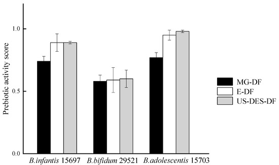 Prebiotic activity scores of B. infantis ATCC 15697, B. bifidum ATCC 29521, and B. adolescentis ATCC 15703 grown on commercial citrus fiber (MG-DF), enzyme-extracted orange fiber (E-DF), or ultrasound-assisted DES-extracted orange fiber (US-DES-DF).