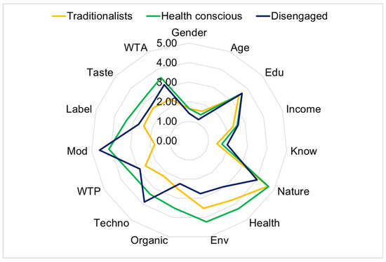 The final centroid values enabled us to determine the “labelling” of the clusters, and thus the assignment of the consumers to a specific cluster. The following three clusters of consumers were identified: (1) the “traditionalists”; (2) the “health-conscious”; (3) the “disengaged”. The features of these clusters are shown in Figure 1 and Table 4, and are described hereafter.