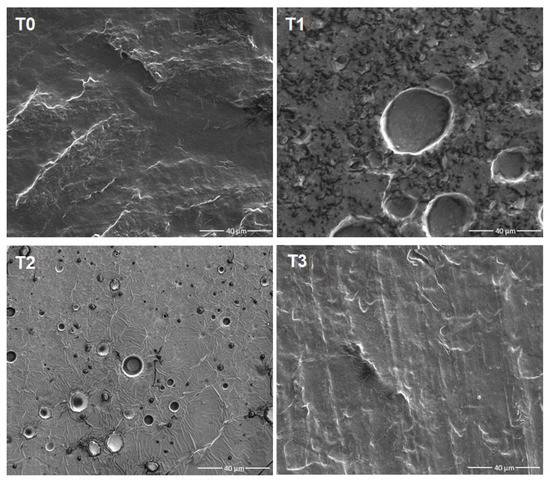 The SEM images of films. T0: PPI film (T0 is the PPI film without α-tocopherol); T1: PPI+TOC film (T1 (PPI+TOC) film is the film formed by direct addition of α-tocopherol (in ethanol) into PPI dispersion); T2: PPIpH12+TOC film (T2 (PPIpH12+TOC) film is the film formed by treating PPI dispersion with the pH-shifting process, followed by direct addition of α-tocopherol (in ethanol)); T3: PPIpH12+NanoTOC film (T3 (PPIpH12+NanoTOC) film is the film formed by treating PPI dispersion with pH-shifting process, followed by addition of α-tocopherol nanoemulsion).