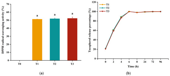 (a) The DPPH scavenging activity of films. (b) The release rate of α-tocopherol in films. T0: PPI film (T0 is the PPI film without α-tocopherol); T1: PPI+TOC film (T1 (PPI+TOC) film is the film formed by direct addition of α-tocopherol (in ethanol) into PPI dispersion); T2: PPIpH12+TOC film (T2 (PPIpH12+TOC) film is the film formed by treating PPI dispersion with the pH-shifting process, followed by direct addition of α-tocopherol (in ethanol)); T3: PPIpH12+NanoTOC film (T3 (PPIpH12+NanoTOC) film is the film formed by treating PPI dispersion with pH-shifting process, followed by addition of α-tocopherol nanoemulsion). The lowercase letters “a” in Figure 2a indicate that there was no statistically significant difference among films with different treatments.