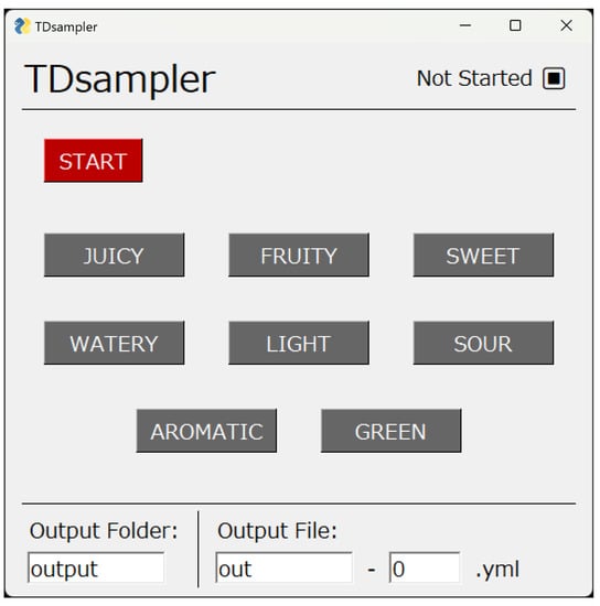 In this section, the typical task of the TDS method and the calculation of dominance proportions are introduced. More information can be acquired from [1,13]. As shown in Figure 1, the tasks of the TDS method are performed using a graphical user interface on a computer. The interface has a maximum of 10–12 buttons with labels of attribute words representing tastes, odors, and mouth feels. In addition, there are two buttons to start and stop the recording. When a panel performs a task, the participant places the food sample in their mouth and simultaneously presses the start button. The panel then selects buttons with attribute words. These buttons correspond to the most dominant sensation that the panel experiences at each moment. Multiple buttons cannot be selected at the same time. After selecting one attribute button, that button is kept selected until another button is selected. The same attribute words can be selected more than one time or never. When the food is swallowed, the panel presses the stop button, and the task is terminated. The computer application records the time when the panel selects the buttons. Individual panels repeat the tasks for the same food sample several times.