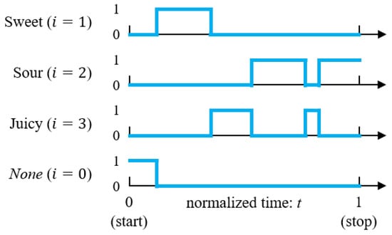 The result of an example TDS task is shown in Figure 2. The response to attribute i in the jth TDS trial is expressed by a binary function of continuous time t. When attribute i is selected at t in jth trial, ; otherwise, . The continuous time t is the normalized time ranging from 0 to 1. The commencement and end of the individual task correspond to and , respectively.