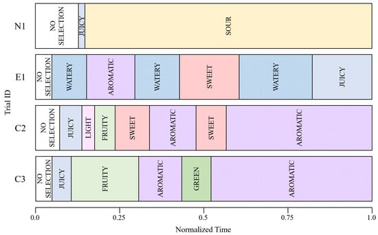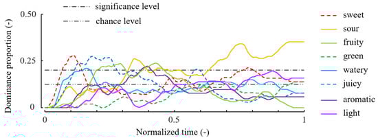 Figure 3 shows the dominance proportions calculated from all the tasks. Typically, in the earlier phase, sweet, juicy, and fruity were dominantly selected. The attribute aromatic was more prominent in the middle phase than in the other phases. Further, sour was frequently selected in the middle phase, and remained dominant in the last period. Similar results were reported in another study of TDS tasks with strawberries [26].