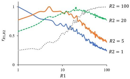 The values for are shown in Table 1. When the values of and were close, the two sets and are correlated more strongly. For example, the indices for and are strongly correlated with ; however, those for and are only weakly correlated with . Figure 4 is the graphical version of Table 1, and shows values with and varying from 1 to 100. Similar to Table 1, the correlation coefficient between and is higher when and are closer to each other. When , the correlation coefficient is greater than for any , indicating that the similarity values for are largely or moderately correlated with those for the other R values.