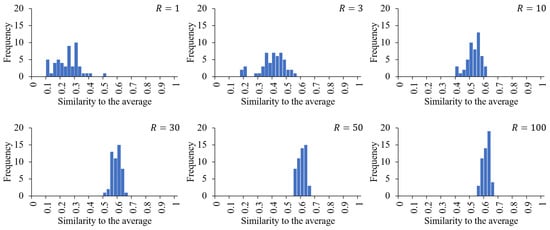 Distribution of similarities between individual trials and the average (P) for and 100. The width of each bin is 0.025. For all R values, the Kolmogorov–Smirnov test did not reject normality with .