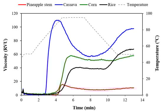 RVA pasting curves of pineapple stem, cassava, corn, and rice starches with 6% (w/w) starch slurry.