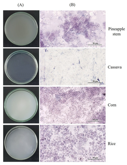 Visual appearance (A) and morphological characteristics (B) of pineapple stem, cassava, corn, and rice starch pastes from RVA measurement. The morphology of the iodine-stained starch pastes was observed with a light microscope at 400× magnification.