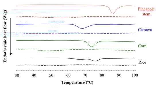 The DSC thermograms of the gelatinized and retrograded starches are shown in Figure 4, and the thermal parameters are listed in Table 3. The pineapple stem starch exhibited the highest gelatinization parameters (onset, peak, and conclusion gelatinization temperatures as well as gelatinization enthalpy) compared to commercial starches (Table 3). High transition temperatures could be due to a high content of amylose, which provides structural stability and increases the granule’s resistance to gelatinization [1]. The gelatinization temperatures are highly positively correlated with the amylose content [23]. The ΔHgel value indicates the loss of molecular order inside the granule and reflects the total crystallinity of the starch granules both in terms of the quality and quantity of the starch crystals [27]. It can be noted that pineapple stem starch is structurally more stable than cassava, corn, and rice starches, possibly due to the high amylose content [1]. Amylose molecules strongly interact with amylopectin molecules to improve the integrity of starch granules [21]. Therefore, starches with a high amylose content usually require a higher temperature to complete the cooking process.
