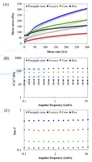 Steady flow curves (A), i.e., shear stress as a function of shear rate, where closed symbols represent upward curves and open symbols represent downward curves, and dynamic viscoelastic mechanical spectra, and (B), i.e., storage modulus, G′ (closed symbols) and loss modulus, G″ (open symbols) as a function of frequency, and dynamic mechanical loss tangent (tan δ) as a function of frequency (C) of 6% (w/w) pineapple stem, cassava, corn, and rice starch gels. All measurements were performed at 25 °C.