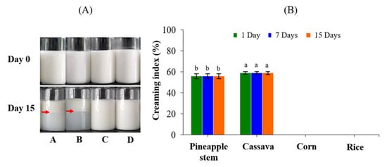 (A) Photographs of the 0- and 15-day stored O/W emulsions stabilized by gelatinized starch samples, with the red arrow marking the cream-serum boundary (A, pineapple stem starch; B, cassava starch; C, corn starch; D, rice starch), and (B) the creaming index of O/W emulsions stabilized by gelatinized pineapple stem, cassava, corn, and rice starches during storage at room temperature for 15 days. Values with different superscripts (a,b) are statistically different (p ≤ 0.05).