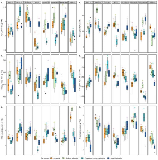 Hydrogen peroxide—H2O2 (A), lipid peroxidation by the malondialdehyde content—MDA (B), catalase—CAT (C), ascorbate peroxidase—APX (D), superoxide dismutase—SOD (E), and proteins in extract enzymatic (F). Se sources with the same genotype are compared using uppercase letters. Using the Scott-Knott test, different letters indicate significant differences between treatments at a probability threshold of 5% (p < 0.05).