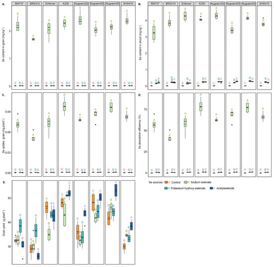 Selenium content in grain (A), Se content in the shoot (B), Se uptake by grain (C), Se absorption efficiency (D), grain yield (E). Se sources with the same genotype are compared using uppercase letters. Using the Scott–Knott test, different letters indicate significant differences between treatments at a probability threshold of 5% (p < 0.05).