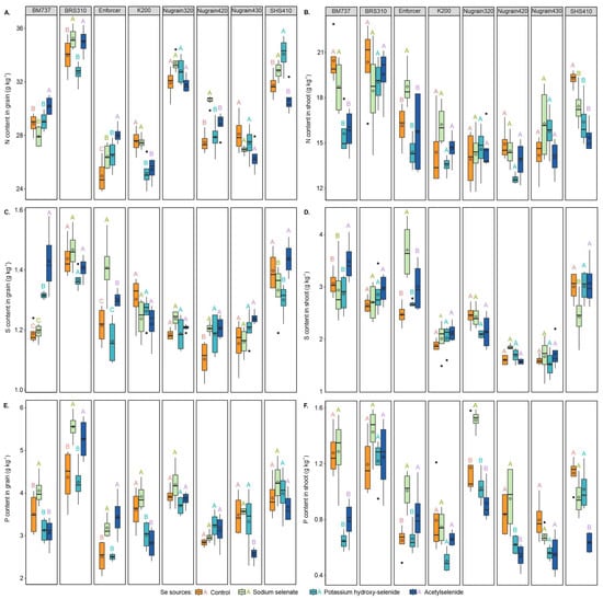 N content in grain (A), N content in shoot (B), S content in grain (C), S content in shoot (D), P content in grain (E) and P content in shoot (F) of the sorghum plants. Se sources with the same genotype are compared using uppercase letters. Using the Scott-Knott test, different letters indicate significant differences between treatments at a probability threshold of 5% (p < 0.05).