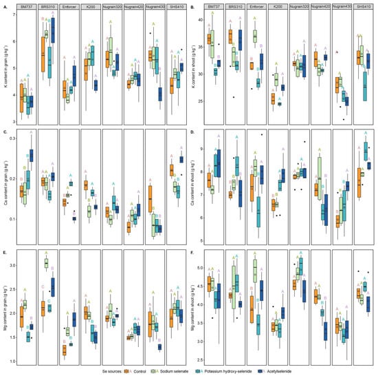 K content in grain (A), K content in shoot (B), Ca content in grain (C), Ca content in shoot (D), Mg content in grain (E) and Mg content in shoot (F) of the sorghum plants. Se sources with the same genotype are compared using uppercase letters. Using the Scott-Knott test, different letters indicate significant differences between treatments at a probability threshold of 5% (p < 0.05).