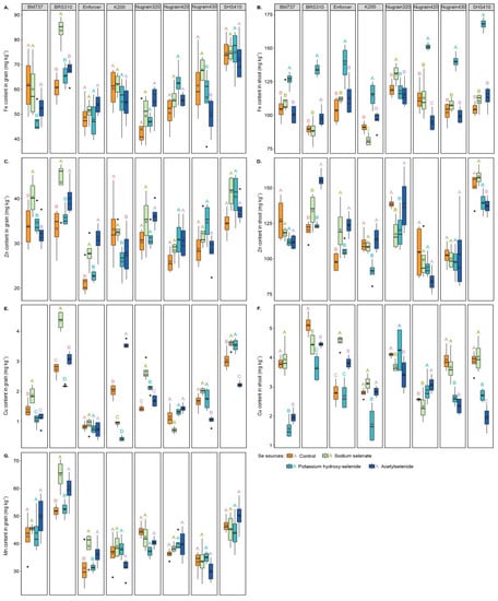In the case of Cu in grains of genotype SHS410, when compared with the absence of Se foliar supply and with acetylselenide, sodium selenate led to increases of 14.77% and 37.75%, while potassium hydroxy-selenide resulted in 13.87% and 37.08% more Cu in the grains, respectively. Similarly, Nugrain420’s application of sodium selenate resulted in 38.23%, 45.52%, and 50.35% greater Cu contents in the grain compared with the treatments without Se foliar, potassium hydroxy-selenide, and acetylselenide, respectively. For Nugrain430, the increase of 37.42%, 48.76%, and 40.91% was observed with the application of acetylselenide compared with the treatments without Se foliar supply, sodium selenate, and potassium hydroxy-selenide, in that order. Furthermore, K200 showed significant increases of 43.38%, 73.39%, and 87.96% with the application of acetylselenide compared with the treatment without Se foliar supply, sodium selenate, and potassium hydroxy-selenide.