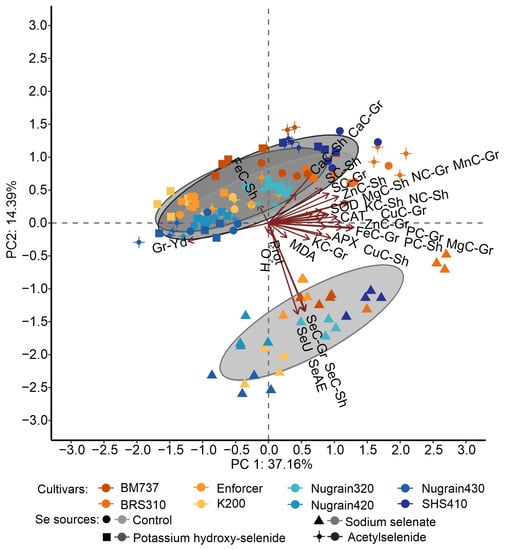 Principal component analysis. Abbreviations: Se content in grain (SeC-Gr) and in the shoot (SeC-Sh); Se absorption efficiency (SeAE); Se uptake (SeU); lipid peroxidation (MDA); hydrogen peroxide (H2O2); catalase (CAT); ascorbate peroxidase (APX), superoxide dismutase (SOD), proteins in extract enzymatic (Prot); grain yield (Gr-Yd); N (NC-Gr), S (SC-Gr), P (PC-Gr), K (KC-Gr), Mg (MgC-Gr), Fe (FeC-Gr), Zn (ZnC-Gr), Mn (MnC-Gr), Cu (CuC-Gr) content in the grain; N (NC-Sh), S (SC-Sh), P (PC-Sh), K (KC-Sh), Mg (MgC-Sh), Ca (CaC-Sh); Fe (FeC-Sh); Zn (ZnC-Sh), Mn (MnC-Sh) and Cu (CuC-Sh) content in the shoot.