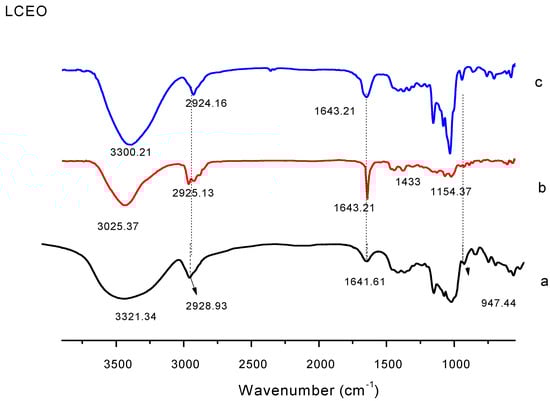 FTIR spectra of LRCD, LCEO, and inclusion complex. (a) LRCD, (b) LCEO, (c) inclusion complex.