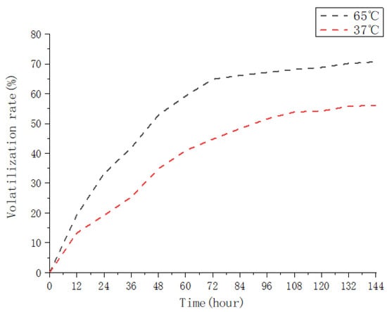 The temperature of the environment had a significant impact on the sustained release performance of the essential oil microcapsules. Figure 4 depicts the volatilization curves of the essential oil microcapsules at 37 °C and 65 °C. It is evident that the release cycle of the essential oil microcapsule is divided into two stages. The first stage corresponds to LCEO encapsulation of more than 60% released at 65 °C and more than 40% released at 37 °C when the fast-release stage reaches 72 h, and the release rate gradually increases to a constant value after 144 h. The “explosive impact” of fast microcapsule release is demonstrated. A significant amount of oil is released in a very short period of time when the oil is in contact with water []. The burst effect results in a significant volume of oil being released as a result of the oil molecules’ rapidly disintegration on the surface of the microcapsule or the biopolymer. As a result of their microscopic particle size and thin biopolymer matrix, the microcapsules burst. In the presence of a solution in the environment, water will be able to permeate the microcapsule wall, resulting in a conversion of the polymer from glass to rubber [].