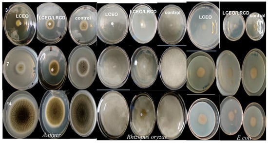 The antimicrobial activity of the LCEO and microcapsules was modified according to previously described methods []. Taking Escherichia coli, Aspergillus niger, and Rhizopus oryzae as the test strains, the exposure timed were determined to be 0 d, 7 d, and 14 d, respectively, according to the MIC determination results and the volatile curve of the essential oil microcapsules. The experiment was carried out in triplicate on a filter paper diffusion culture plate (90 mm in diameter). Fresh blocks of Aspergillus niger, Rhizopus oryzae, and Escherichia coli were inserted in the center of the sterile, coagulated LB (culture Escherichia coli)/PDA (culture Aspergillus niger, Rhizopus oryzae) media. After that, the culture was inverted onto the top of the culture dish containing the essential oil or microcapsules. A sealing film was used to cover the culture dish. Using the cross technique, the culture was inverted at 37 °C or 27 °C for 0, 7, and 14 days to determine the diameter of the microbial circle. The blank control group received neither essential oil nor microcapsules.