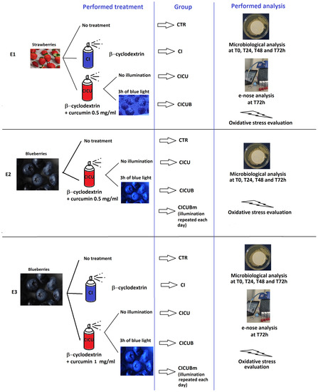 The study was performed on strawberries and blueberries, separately treated in three experiments. All the experiments focused on the antimicrobial effects of the curcumin and its photoactivation, but in order to investigate separately the impact of the curcumin concentration and that of multiple irradiations, two more experiments were performed.